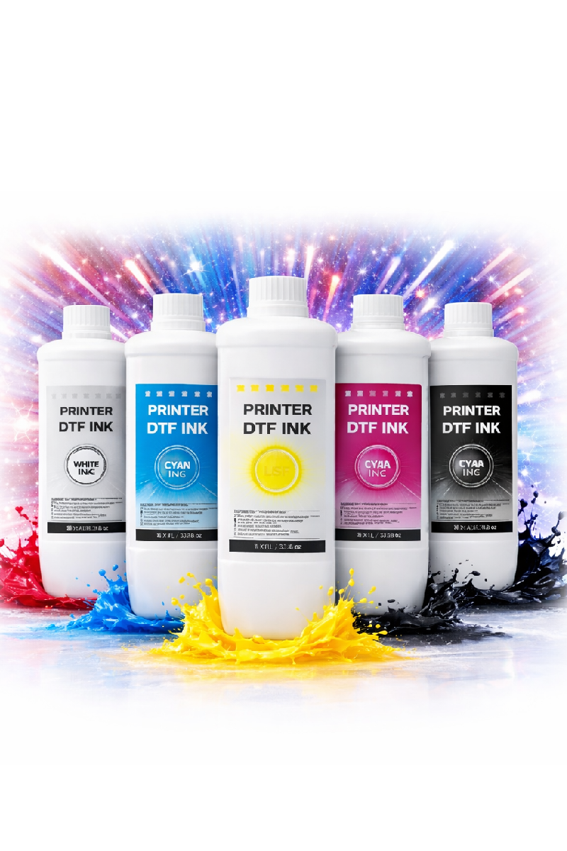 The DTF Printer USA Complete Ink Bundle includes Cyan, Magenta, Yellow, Black, and White inks — specially formulated for high-performance Direct-to-Film (DTF) printing.
