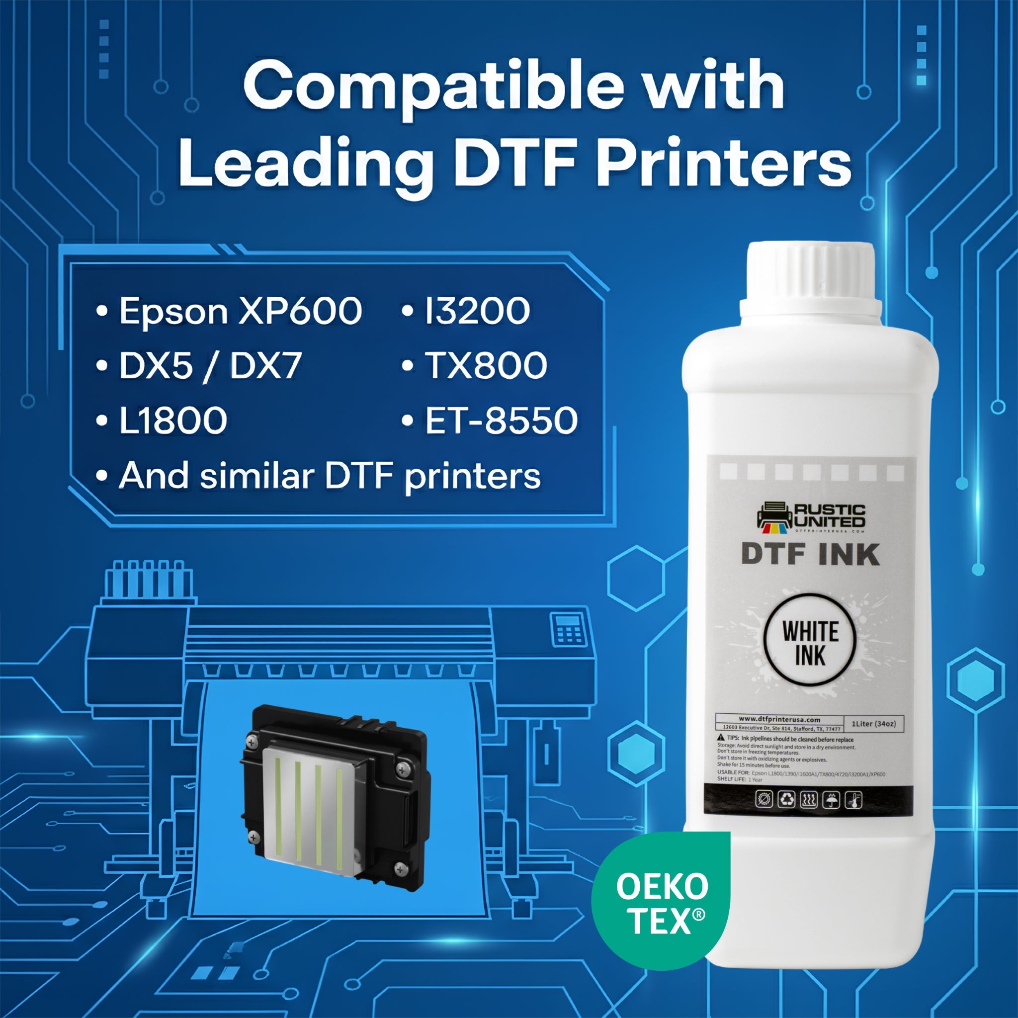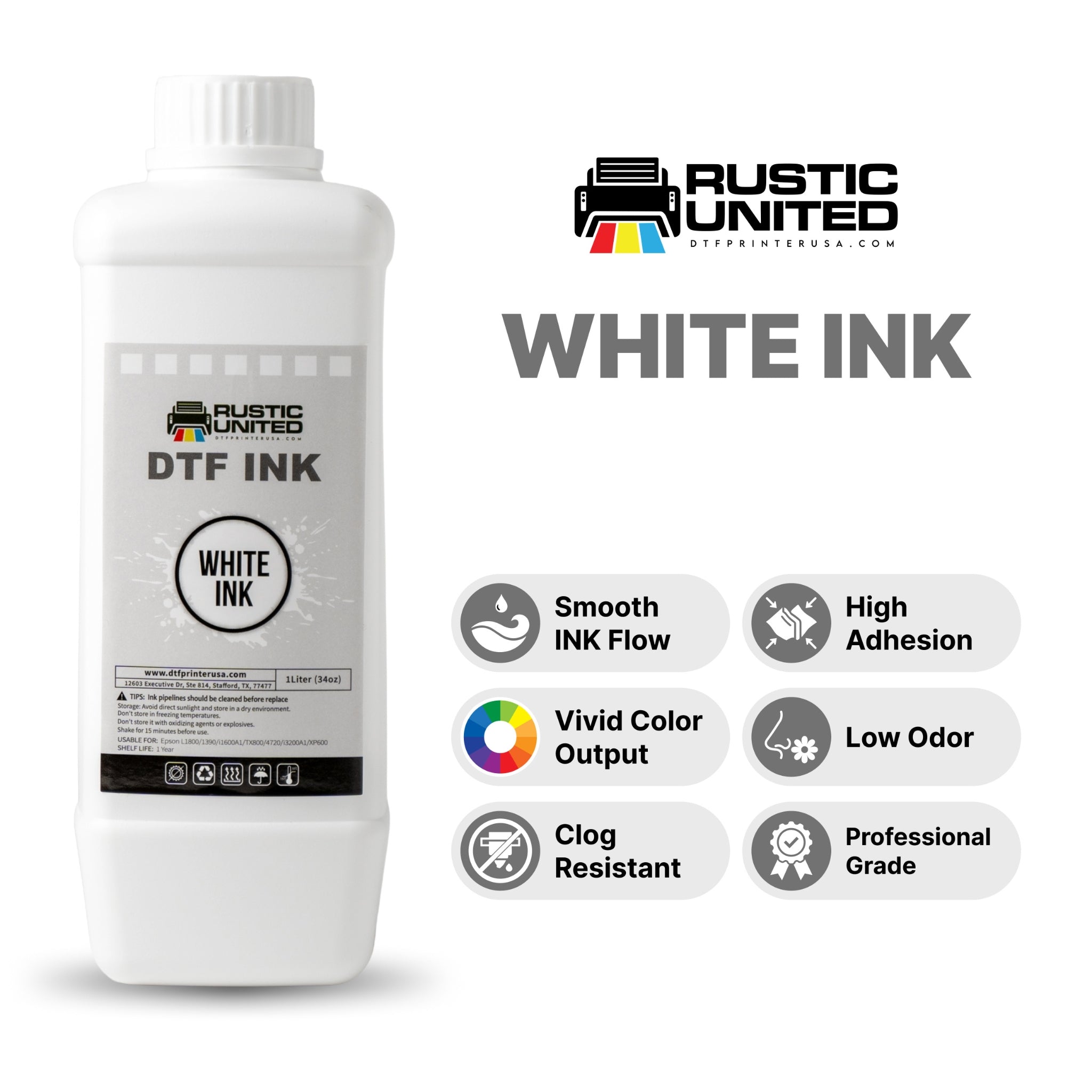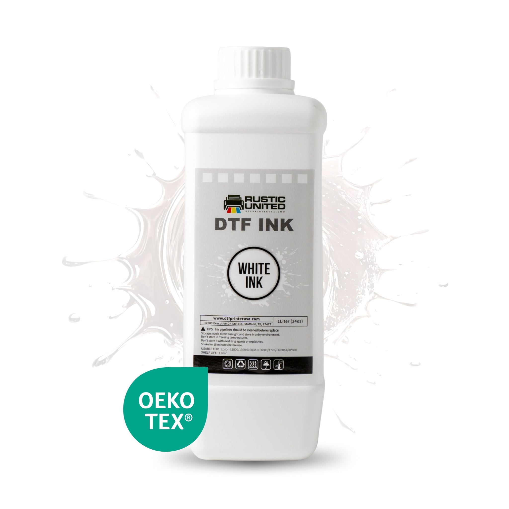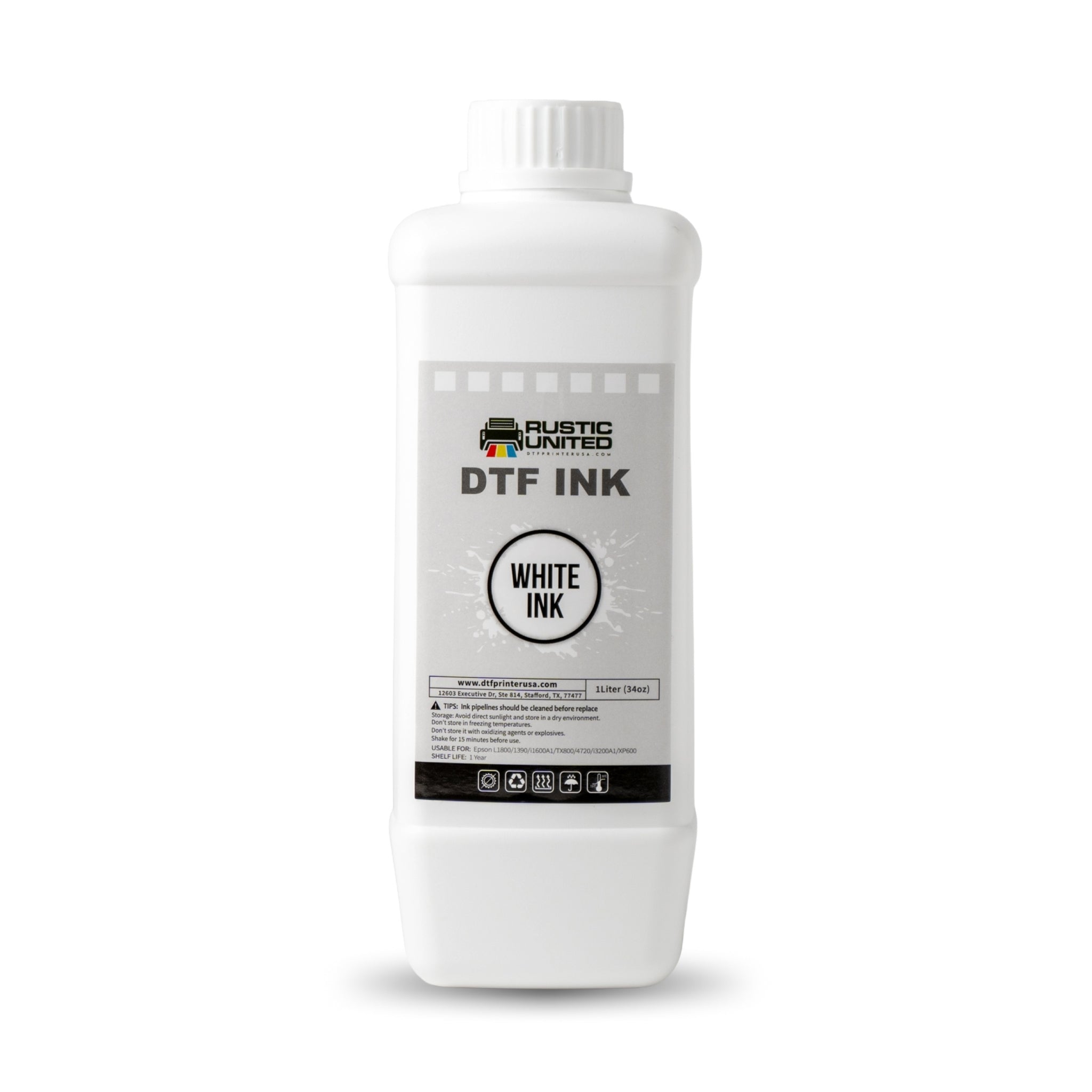 DTF Printer USA White Ink is specifically formulated for creating vibrant, high-quality direct-to-film (DTF) prints that can be heat-transferred onto a variety of materials, including cotton, polyester, nylon, leather, hoodies, aprons, tote bags, and more. This non-toxic, water-based ink delivers sharp, clear designs and a solid white base, ideal for adding vivid detail to your projects.